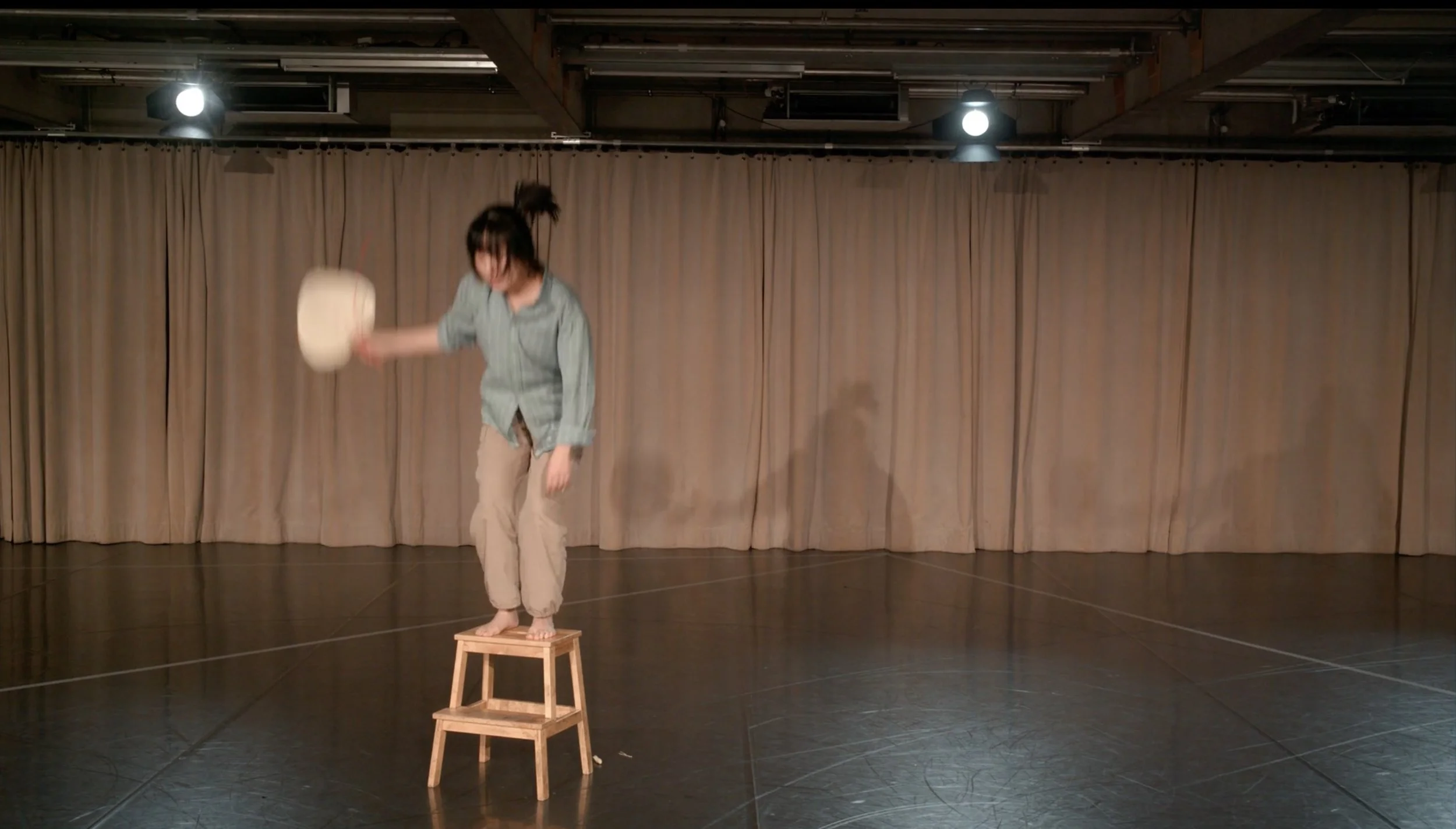 Naming explores a continuous transitional psycho-somatic state, where repetition—used as a structural improvisational method—serves as both a point of departure and a process of transformation. How does it evolve from its initial impulse? Do I accept and follow the internal and external stimuli of the moment? Naming is an ongoing, unfinished exploration of my own philosophical inquiry: Who am I? Where am I going? What lies between my desires and my reason? From the perspective of post-structuralism, objects, gestures, and movements continuously generate and dissolve meanings through this evolution. How does the audience form associations in this process? The work builds upon my research project Ongoing Repetition, which I initiated in March 2024.